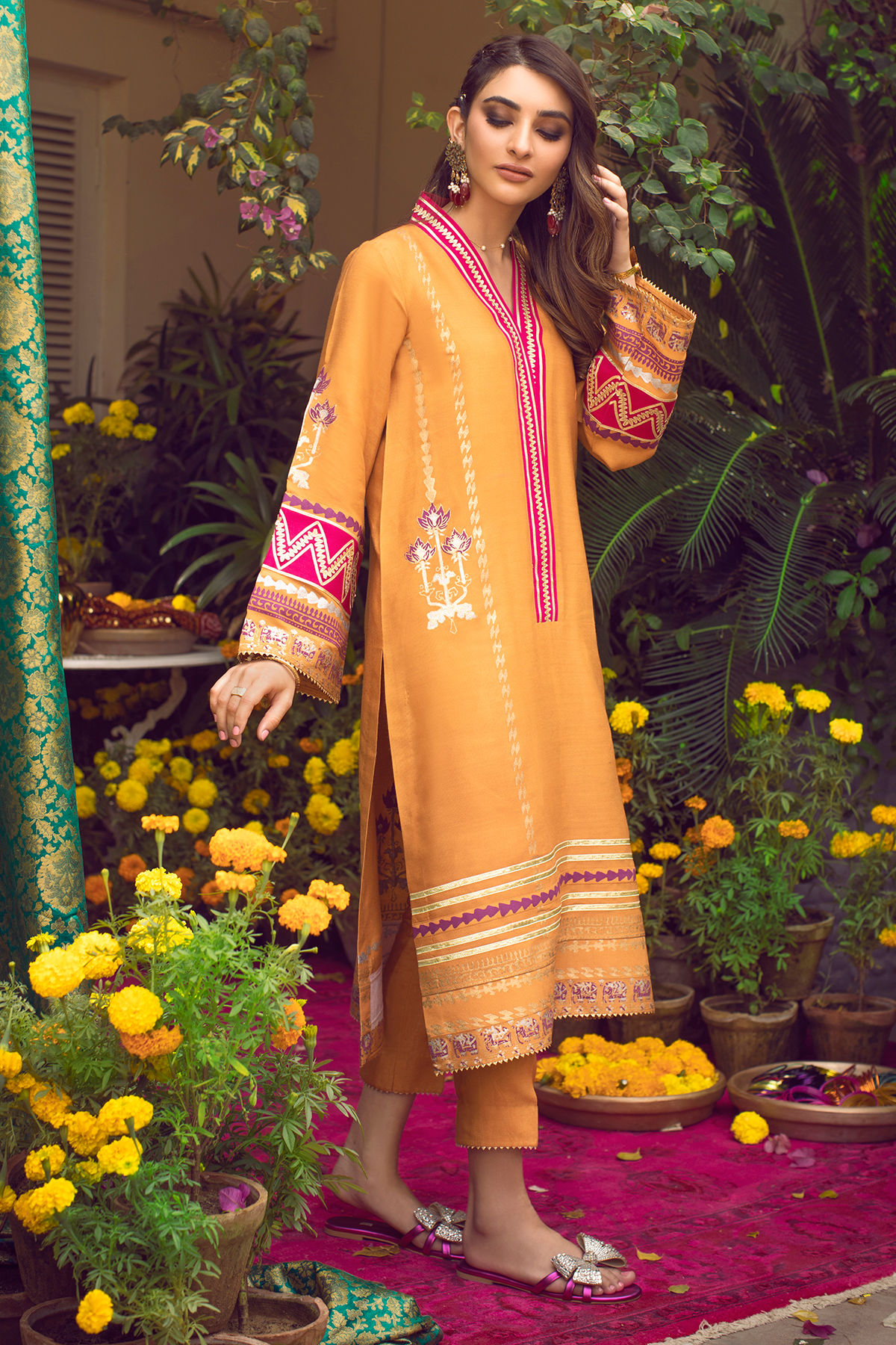 Turmeric orange hand block printed shirt featuring color blocked and gota details on the neckline and sleeves, the outfit is adorned with gota details on the hemline and it comes with straight pants featuring gota details on the hemline.
