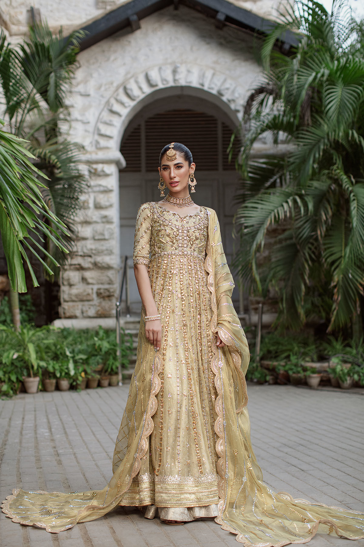Gorgeous shade of marigold on a gold metallic zari canvas featuring old school details of gota and zardozi on bodice. The zari panels are adorned with gota details on each panels on front and back. The outfit is paired with matching zari lamé dupatta featuring sequins details and lace finishings. The outfit can be paired with damask dhaka for a more festive look.