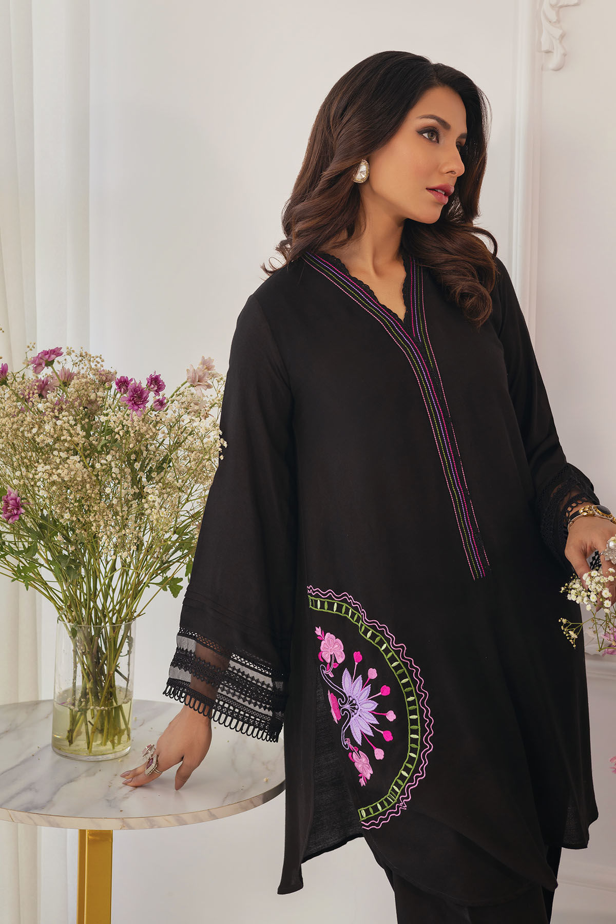 Knee length co-ord set featuring multicoloured appliqué motifs on side seam. The neckline is adorned with multicoloured running stitch details. The top is paired with straight shalwar to create a head turning look.